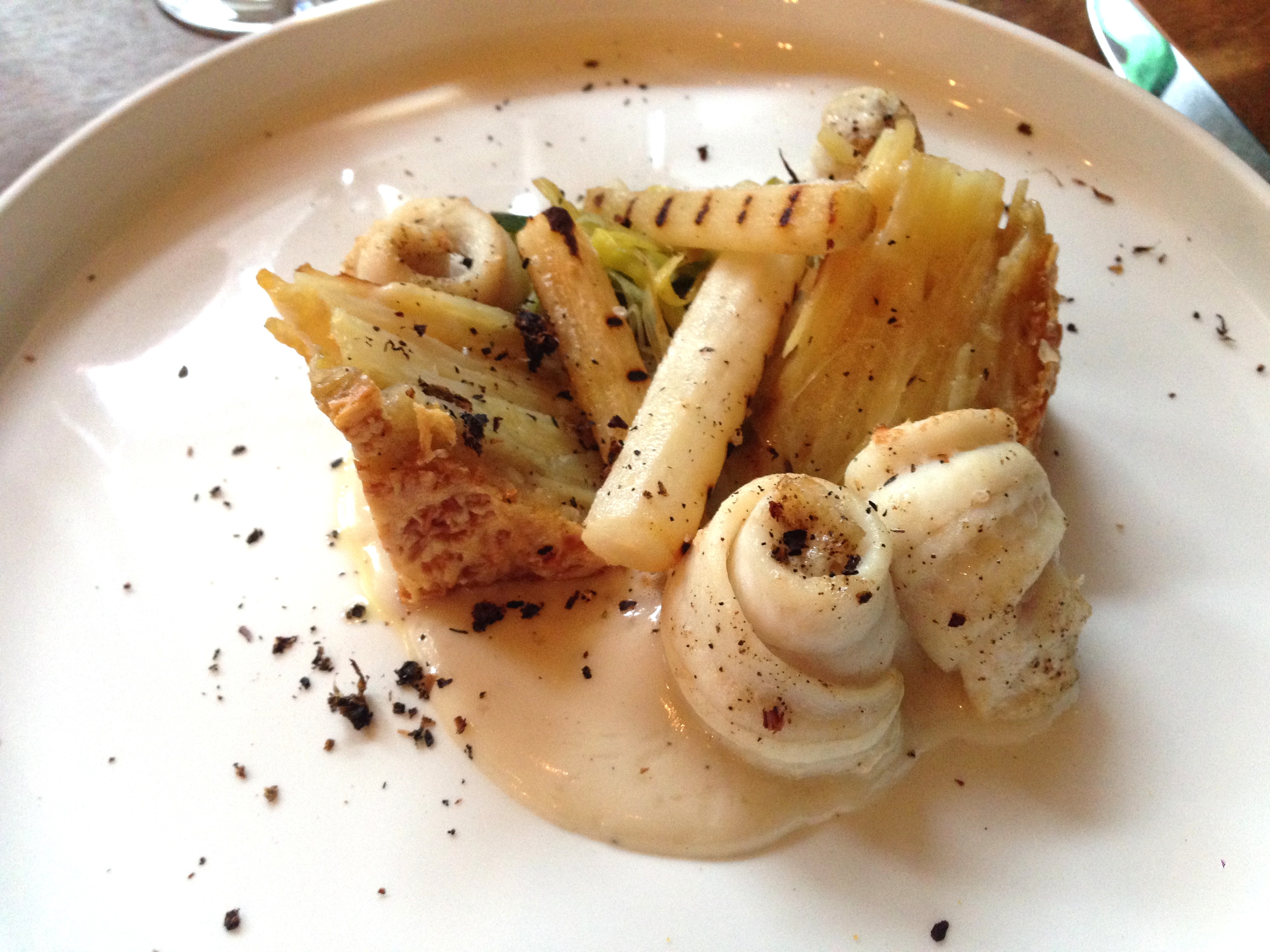 Mijn enthousiasme houdt aan tijdens het hoodgerecht: de tongrolletjes blijken het enige klassieke op het bord. De op hun zij liggende driehoeken aardappelgratin, de geschroeide schorseneren, de prei en de saus met duidelijke sherrytoets vervolledigen. Aan de overkant moet er aan ribbetjes geknaagd worden en de handen worden daarbij niet van vettigheid gespaard. Tijdens het eten verschijnt alvast een set naar citroen geurende doekjes om die ‘pollekes’ achteraf schoon te maken.
