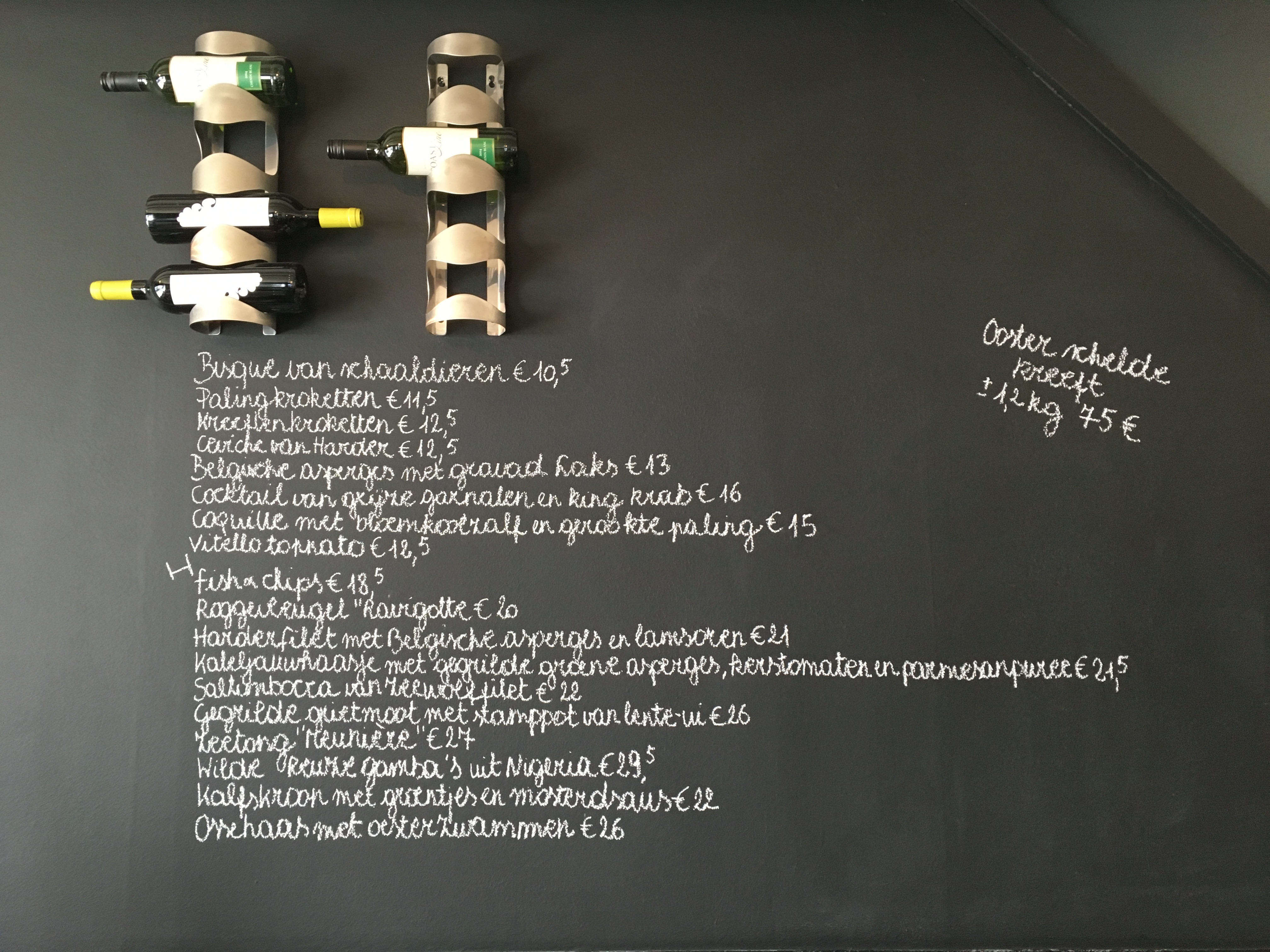De menukaart bulkt logischerwijs van de vis. Elke dag kun je er kiezen tussen kabeljauw, zeebaars of zeewolf met drie bijgerechten (koolhydraten, groenten, saus), verder ook plateaux fruits de mer en een uitgebreide lijst selecties op het krijtbord. Daarnaast werken ze met themadagen: een gambamenu (€ 28,50 voor drie gangen) op woensdag, een paëllamenu (idem qua prijs) op donderdag.