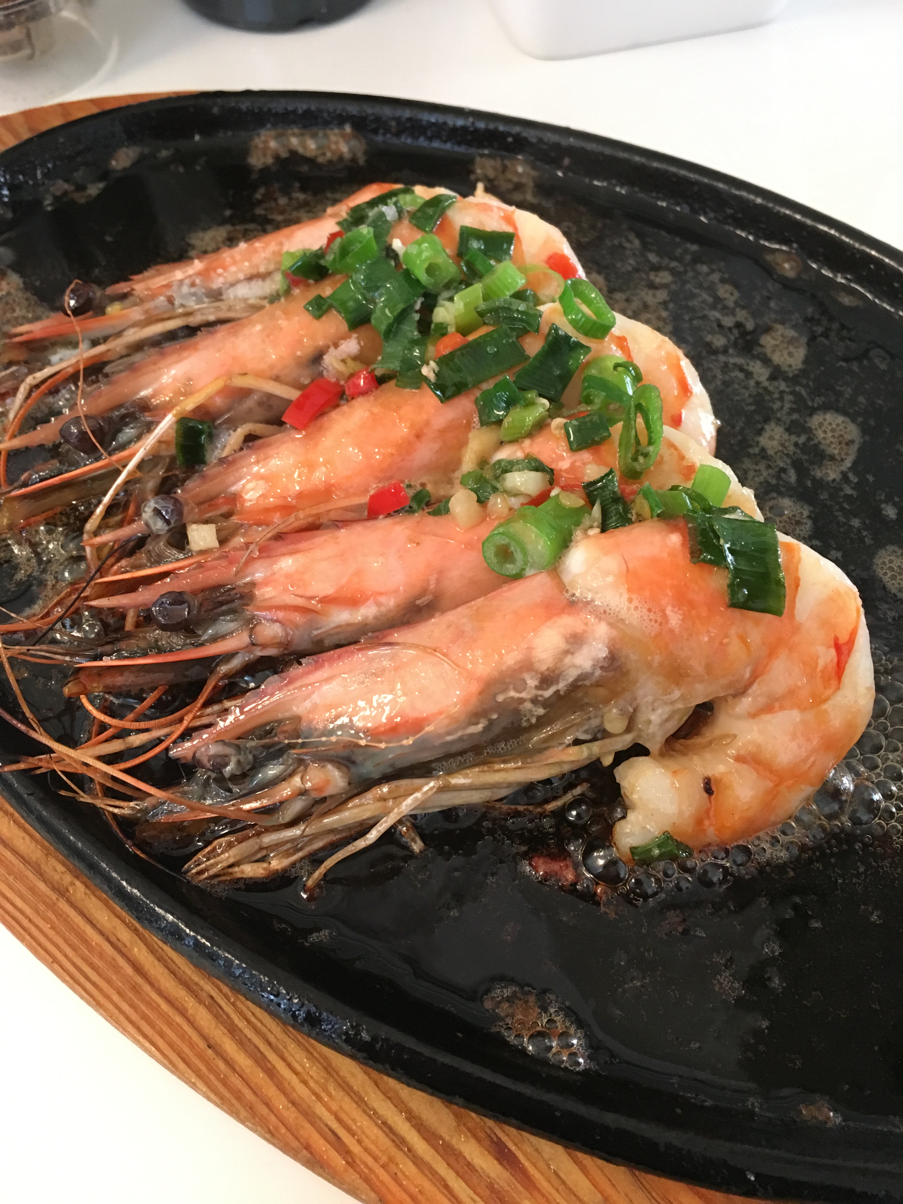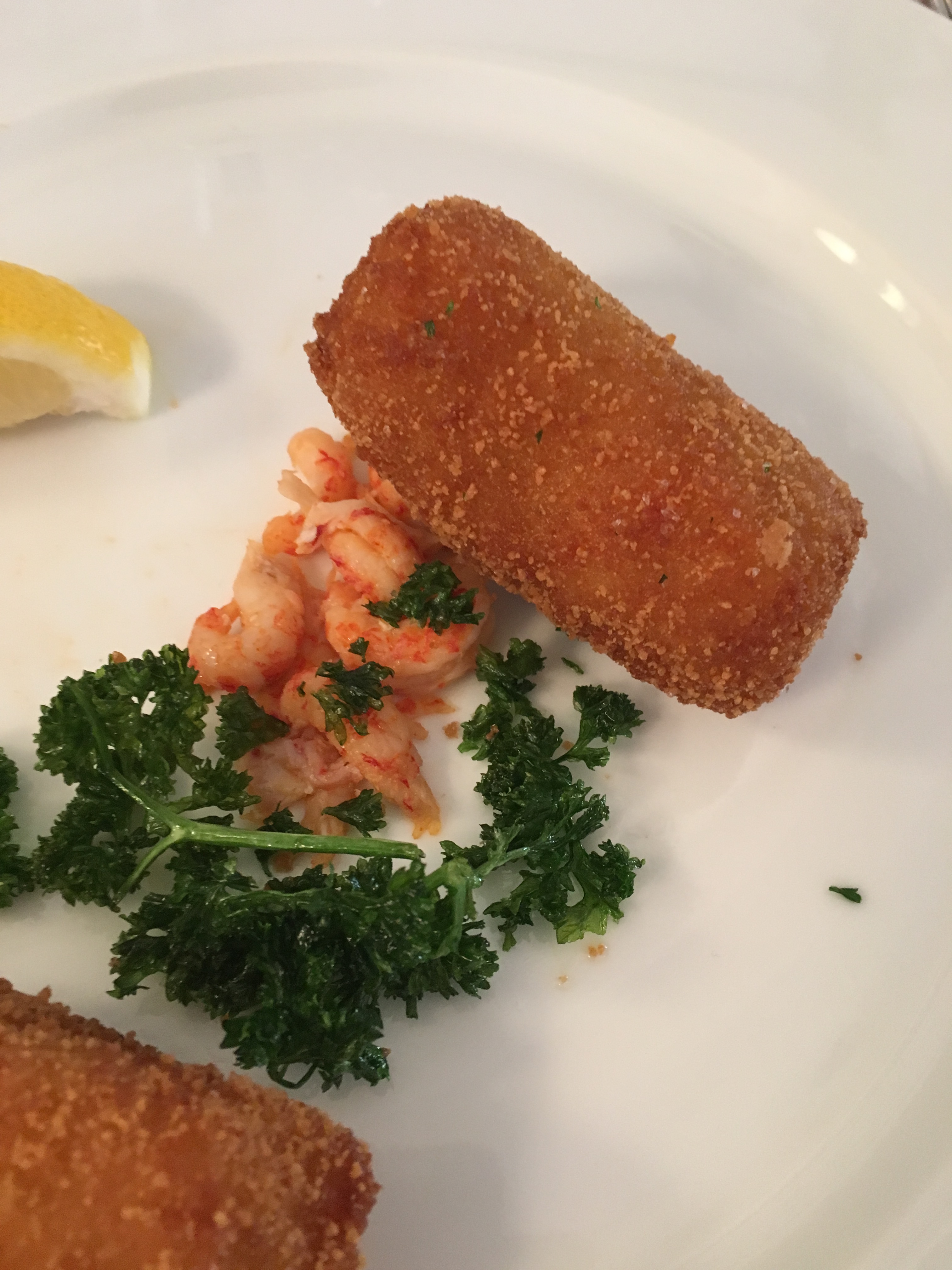 De knisperende gamba’s die à la plancha geserveerd worden lonken, maar omwille van die zeevruchten zou nu nog een menu bestellen er wat over zijn. Een alternatieve oplossing vind ik bij de voorgerechten: daar staan tevens gamba’s op gietijzer (4 stuks – € 10,50). Verkocht, in combinatie met de kreeftenkroketten (€ 12,50) van op het bord! Ik geniet van de gamba’s en neem me voor om het volledige gambamenu bij een volgend bezoek op woensdag eens uit te testen. Geen klachten over de kreeftenkroketten, alleen maken die voor mij niet speciaal meer indruk dan een goede huisbereide garnaalkroket.