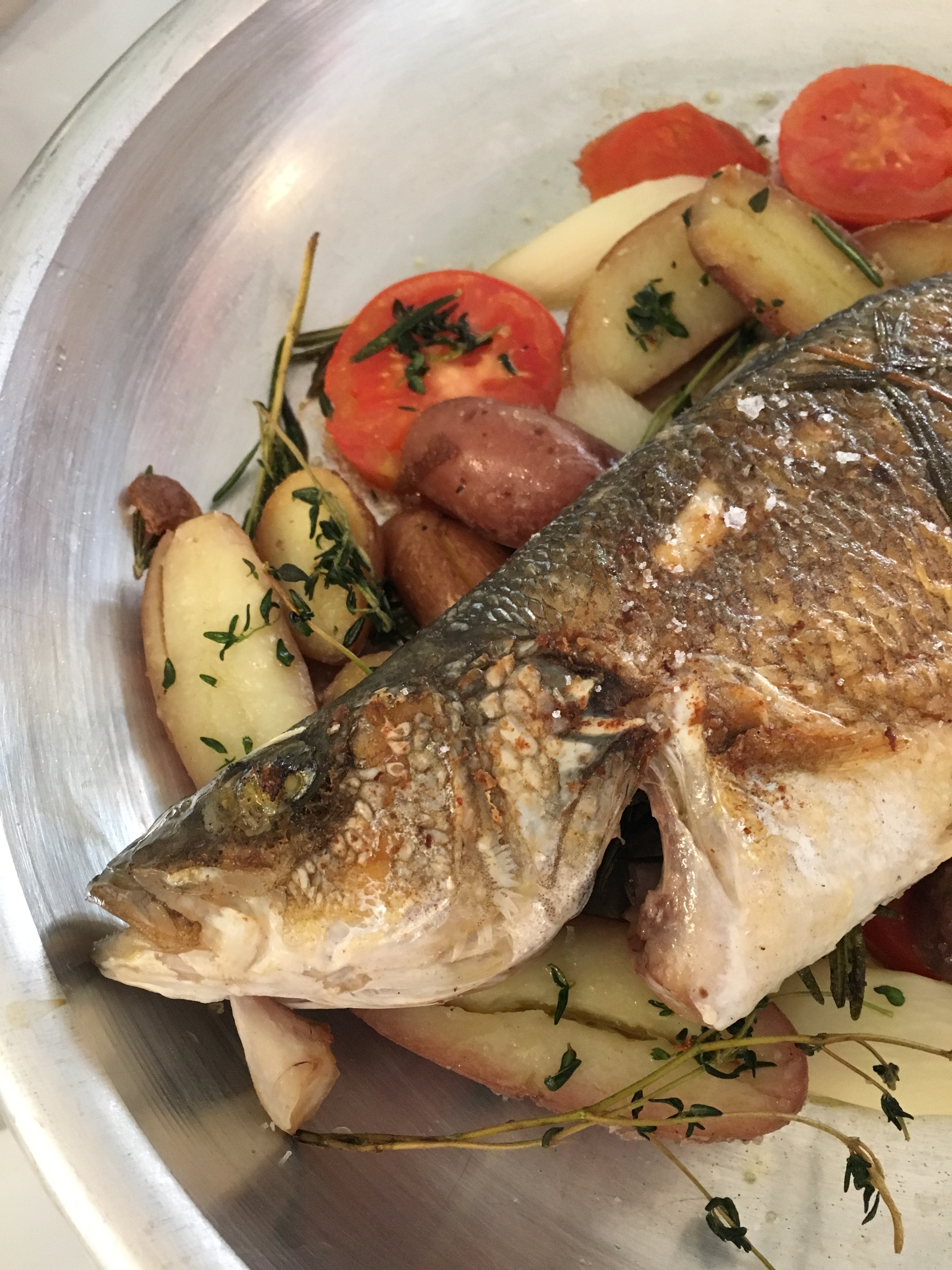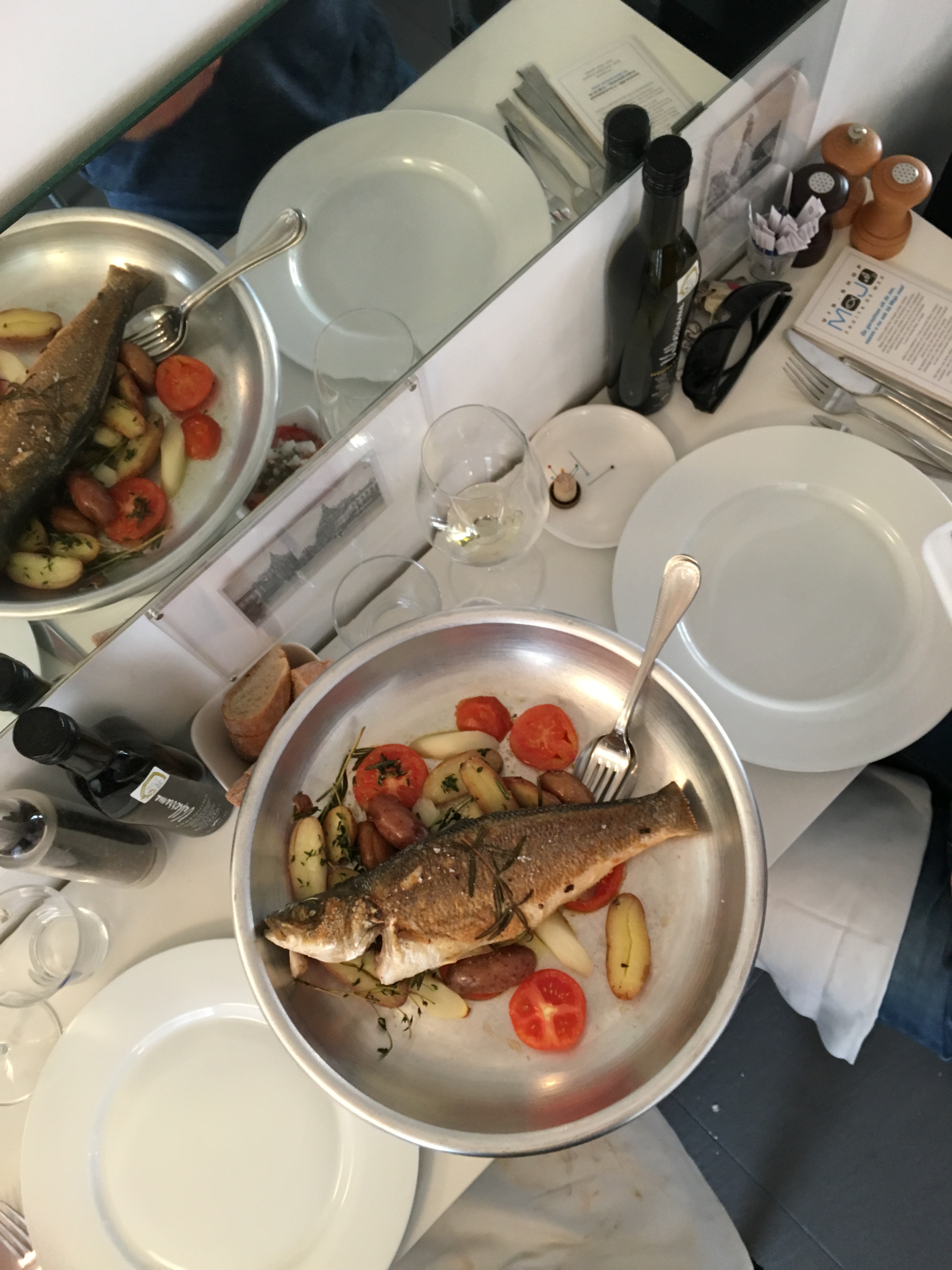 Wat een plaatje, die zeebaars… Dezelfde houder en schaal van de fruits de mer wordt gebruikt om dit visje op onze toog te zetten. Bij de begeleiding merken we naast tomaten en aardappelen tevens witte asperges op: een verrukkelijke combinatie. Het genieten blijft voortduren. Ik hou echt van zeebaars: het gevoel van de vis in je mond en tussen je tanden is zo specifiek en tegelijk zalig. De gastvrouw komt als ik ietwat sukkel met fileren vragen of alles lukt en naar wens is. Absoluut, meer dan naar wens zelfs!
