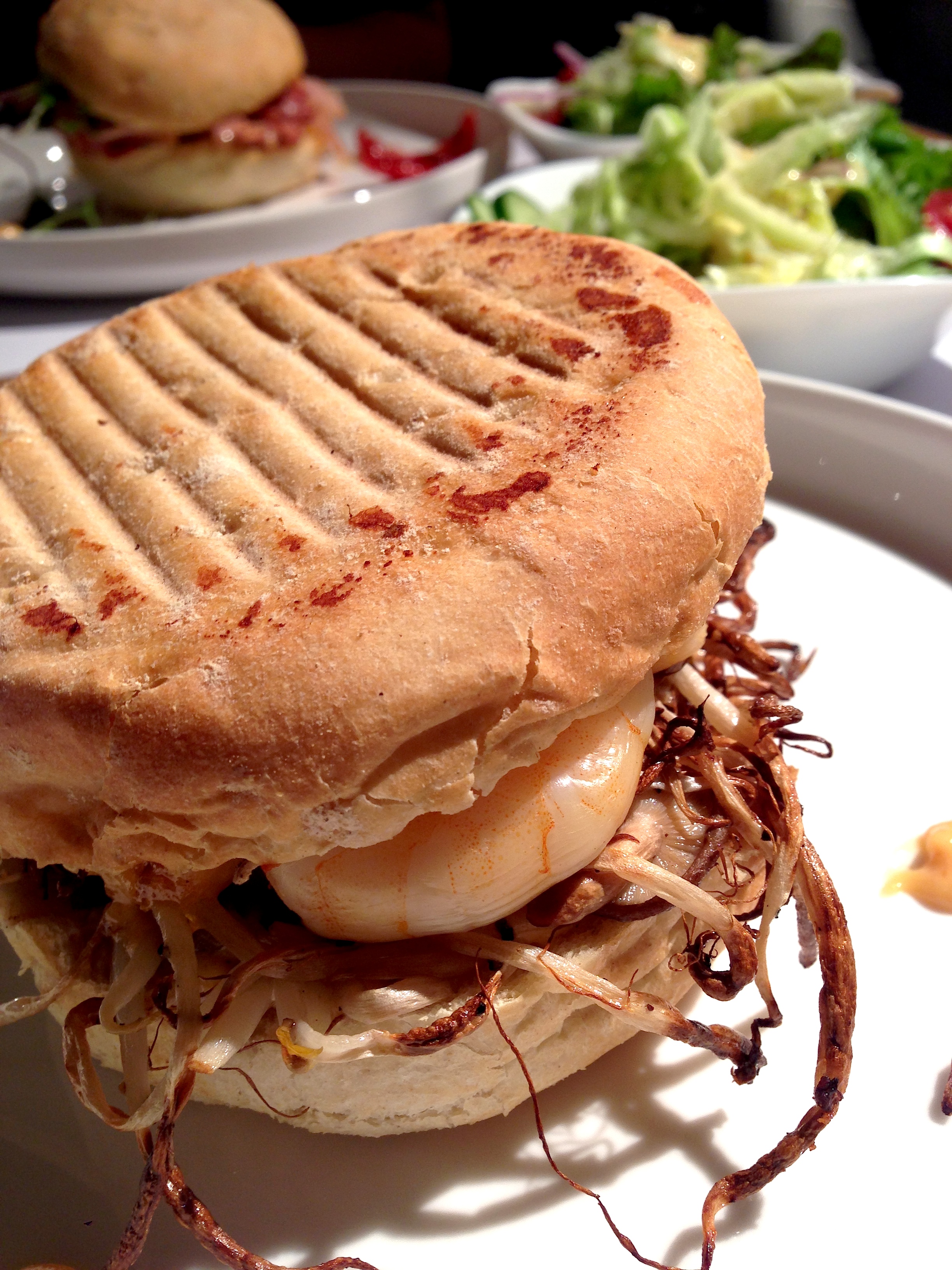 Ik wist dat het duur is bij ViVa Sara, maar dat de broodjes de prijzen bij De Superette overtreffen had ik nu ook weer niet verwacht… Toch laat ik mij niet afschrikken en bestel de warme ovenkoek met scampi, sojascheuten en shiitake (€ 14) en een homemade lemonade: the green one (€ 2,50 – met komkommer, basilicum en limoen). De prijs van de huisgemaakte limonade vind ik dan weer wel erg redelijk. In Gent of Antwerpen betaal je daar makkelijk een smakje tot een smak meer voor.