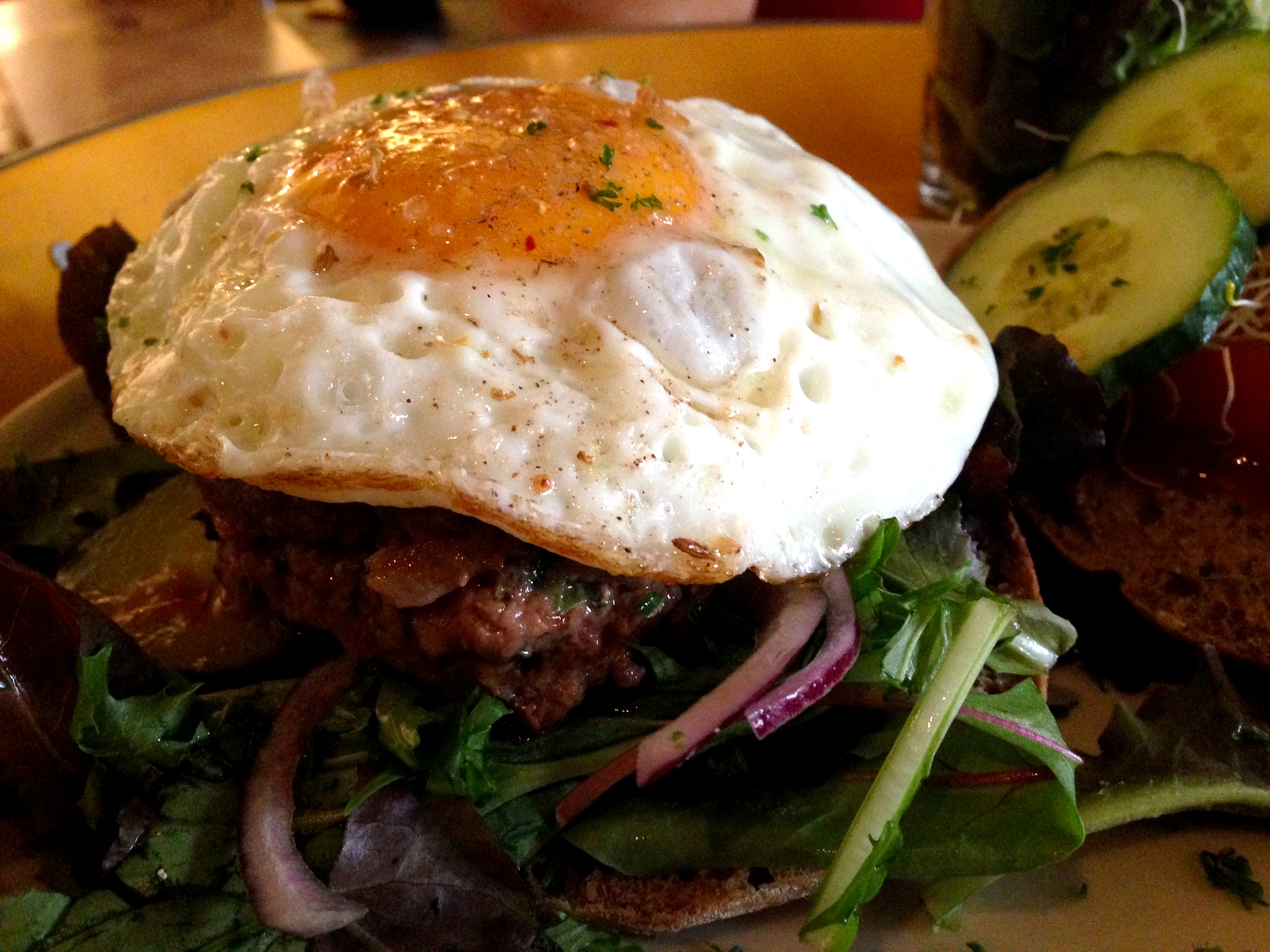 Op de menukaart laat ik de wraps, de panini’s en de tapas meteen links liggen: we zijn hier voor een burger. Geen kalf (op het suggestiebord), zalm of veggie, maar de huisgemaakte burger van 100% rundsvlees. Ik heb een spiegeleizwak, dus valt mijn oog vrij logisch op de Horse Eye (€ 9) met dus spiegelei, rucola, tomaat, augurk, rode ui, ketchup en mayonaise. Daarbij drink ik een Bockor pils (€ 2).