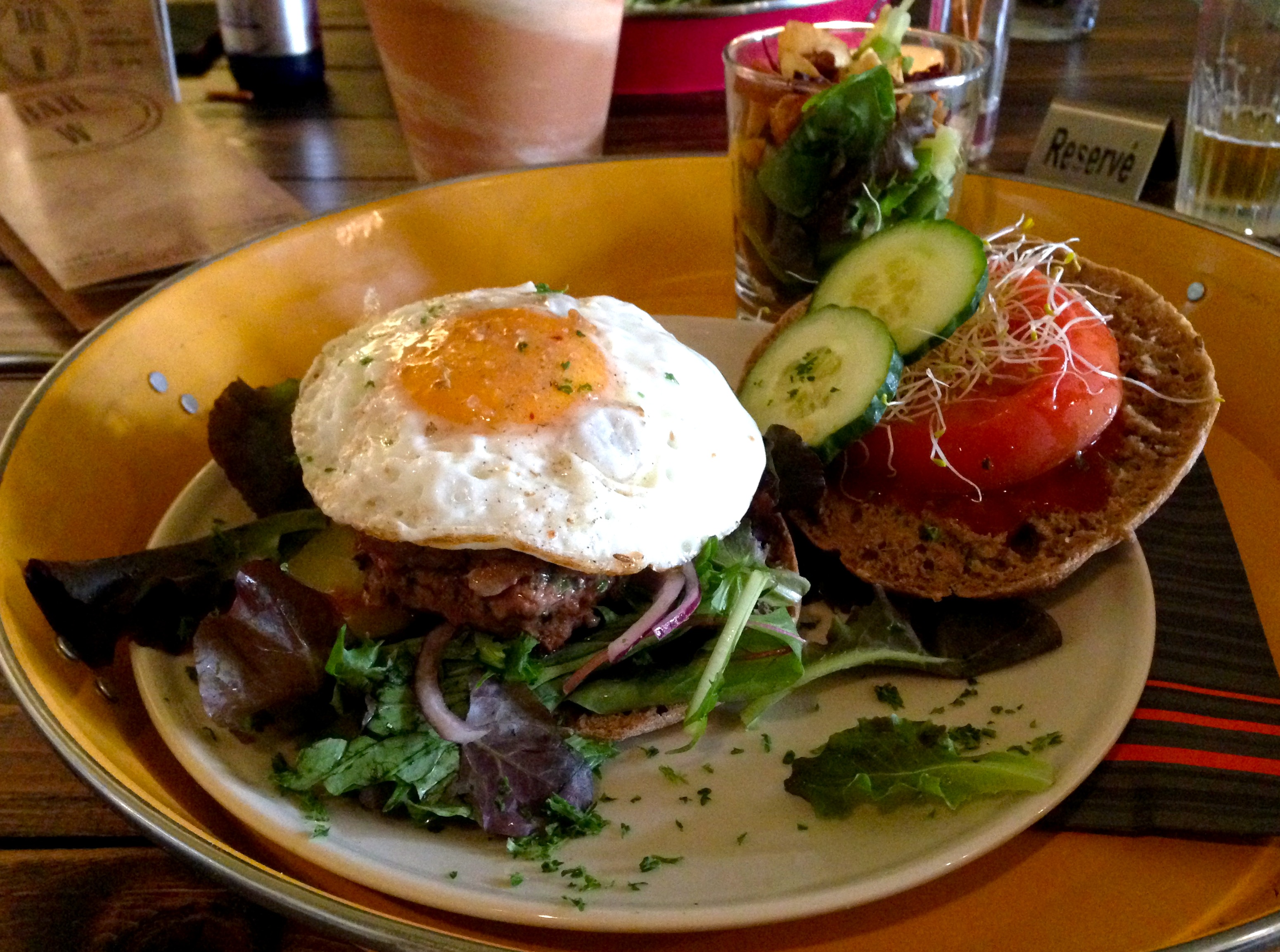Voor ons komt een dienblad te staan – geel voor mij, rood voor de collega – met onze burger en een extra slaatje met groentenchips in een glas. De burger ligt nog in spreidstand en bij het dichtplooien besef ik meteen dat dit geen propere lunch wordt. Ik begin met mijn Horse Eye burger te halveren en ga dan aan de slag. Wunderbar brengt een burgerverhaal dat minder zwaar op de maag ligt dan de fast-food-versie. Hier geen frietjes, maar een slaatje als side dish. En ook de burger zelf bulkt van de gezonde en pure ingrediënten: sla, rode ui, komkommer, tomaat, scheuten in de groentencategorie. Op de medium gebakken rundsburger ligt mijn geliefde spiegelei. Helemaal goed bevonden!