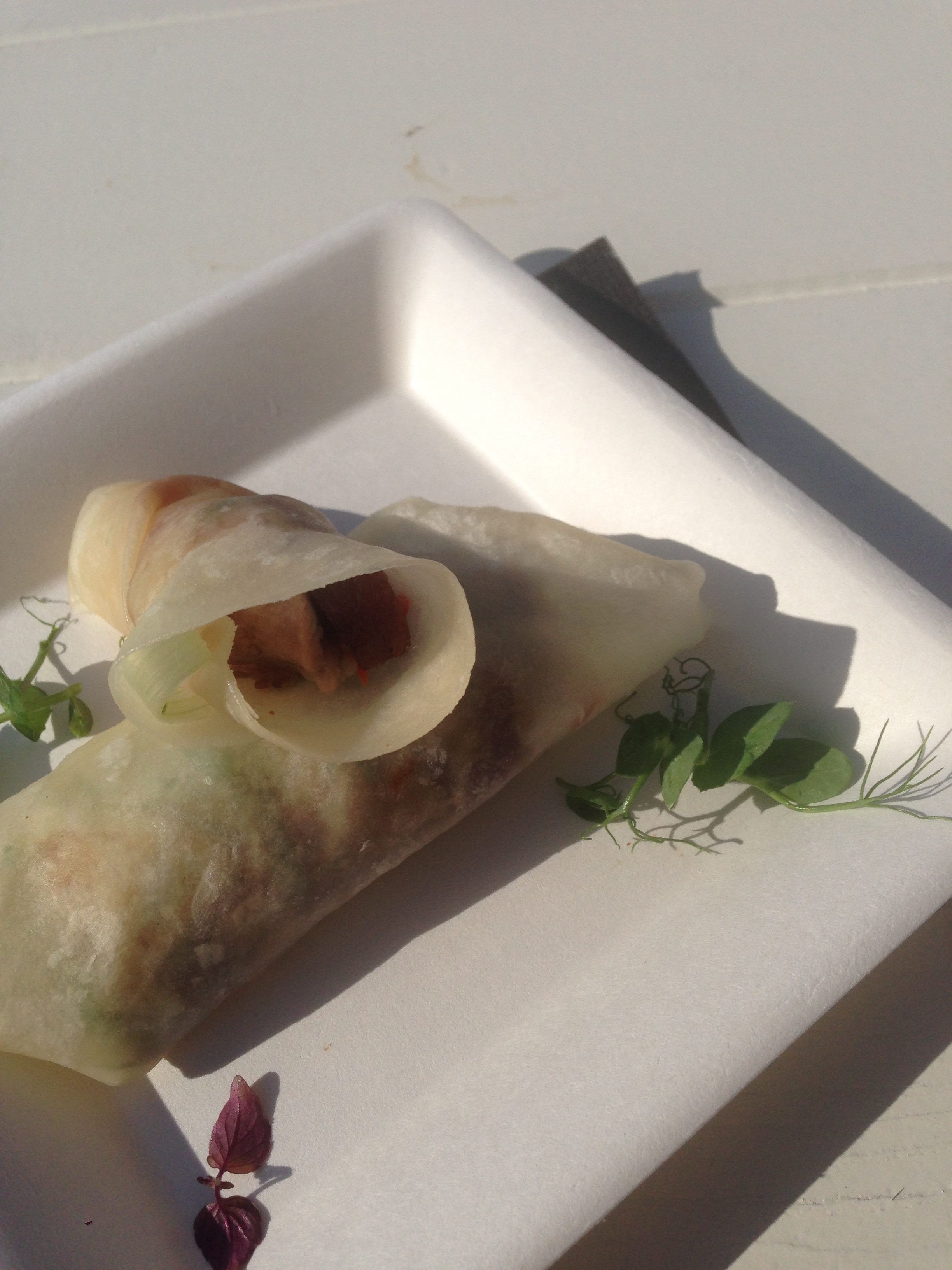 Huisgelakte pekingeend, hoisinsaus, verrijkt met pinda en miso; komkommer, chili, lente-ui, gestoomd flensje | door Cuichine Lees verder